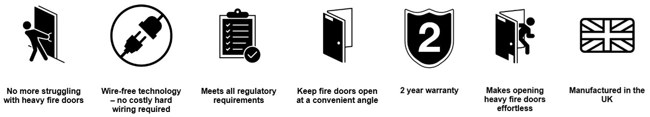 Freedor SmartSound is a unique wireless device installed at the top of a fire door that allows the door to swing freely and be left open at a convenient angle. Freedor SmartSound is a battery-powered overhead wireless door closer which makes opening and closing a fire door effortless. A device which allows you to place your door open at a convenient angle and closes on the sound of the alarm.